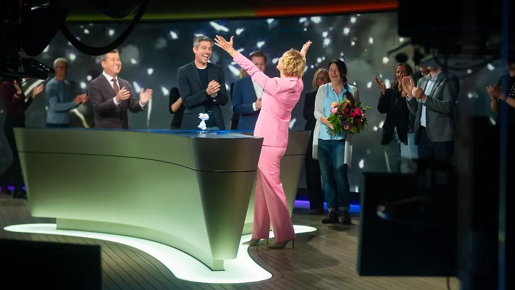 Dann erschien ein Feuerwerk auf dem großen Bildschirm, auf dem sonst die Nachrichten illustriert werden. Zahlreiche Kollegen liefen ins Studio, klatschen Applaus und überreichten der sichtlich gerührten Moderatorin einen großen Blumenstrauß. Miosga, die an ihrem Abschiedsabend einen auffälligen pinkfarbenen Anzug trug, konnte es gar nicht fassen: "Oh, wie süß. Alle sind da. Danke."