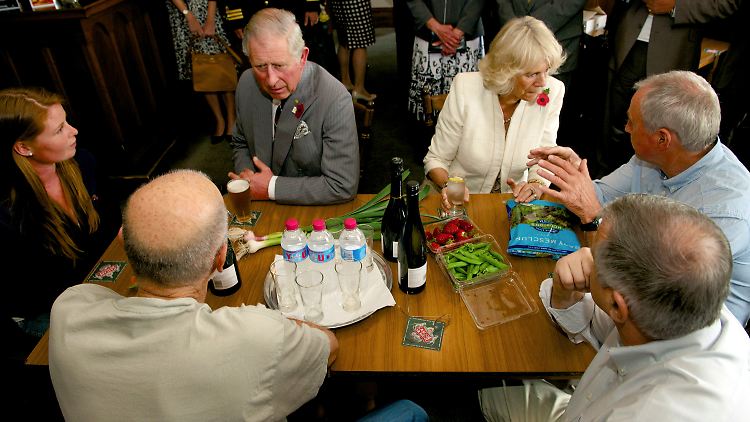 Nach ihrer Erfrischungspause in dem Pub besichtigten Charles und Camilla eine Schafsfarm. Der Thronfolger zeigte sich dabei sehr interessiert an den Merinoschafen und verbrachte rund 20 Minuten mit ihnen auf der Koppel, während Camilla mit Landfrauen Tee trank.