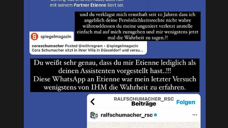 Diese Klarstellung hat Cora Schumacher nicht gefallen. Mit scharfem Ton greift die 47-Jährige ihren Ex-Mann Ralf Schumacher an, weil dieser seine frühere Liebe mit einem Screenshot eines privaten Whatsapp-Chats der Lüge überführen wollte. "Du verklagst mich ernsthaft seit 10 Jahren, dass ich angeblich deine Persönlichkeitsrechte nicht wahre, während du ungeniert meine verletzt", schreibt Cora Schumacher in einer Instagram-Story, die am späten Freitagabend veröffentlicht wurde. "Wie erbärmlich muss ein Mensch sein, rechtswidrig private Whatsapp-Nachrichten zu veröffentlichen, um die Wahrheit zu verschleiern."