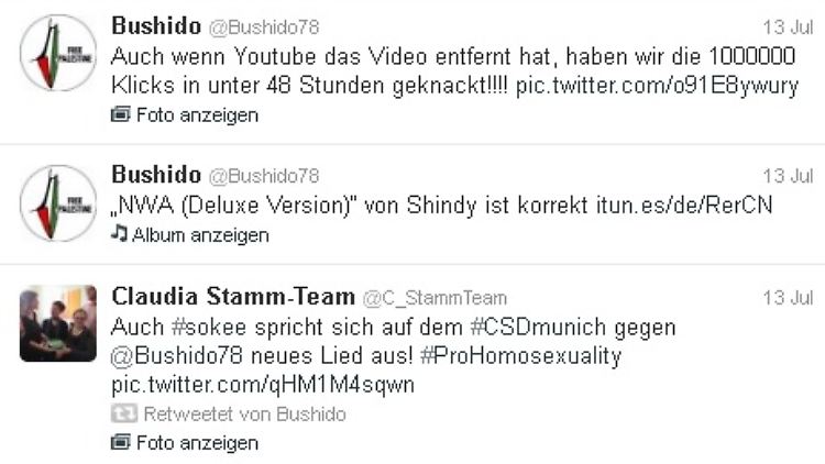 Das Video, das von Bushido offiziell eingestellt wurde, ist inzwischen gesperrt worden. Aber natürlich kann das Video von anderen Personen und auch unter Missachtung der Nutzungsbedingungen eingestellt werden. Das Problem ist: Bei der Vielzahl von Videos kommt Youtube mit der Kontrolle und dem Löschen kaum noch nach.