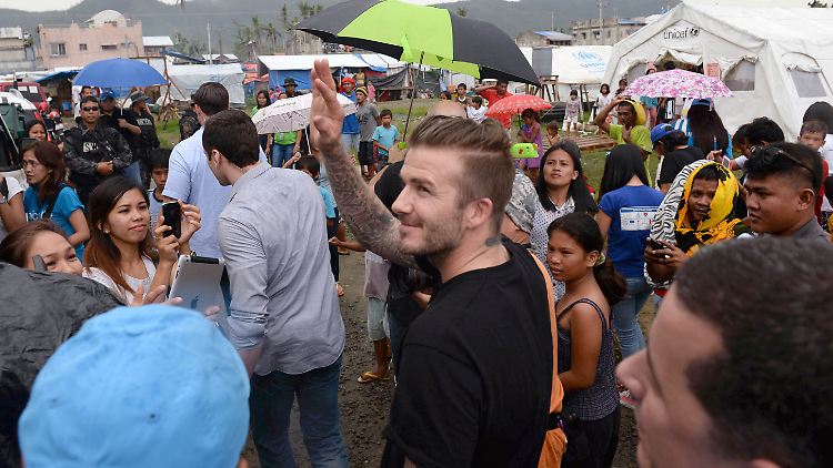 Der modebewusste Ehemann von Ex-Spice-Girl Victoria Beckham lief in einem schwarzen UNICEF-T-Shirt durch die Zeltstadt in Tacloban, wo der Taifun "Haiyan" besonders heftig gewütet hatte. Der vierfache Vater verbrachte etwa eine Stunde in einem als Krankenstation dienenden Zelt, hätschelte Babys und spielte mit Kindern. Anschließend brachte er Hilfgüter zu einem UN-Lager.