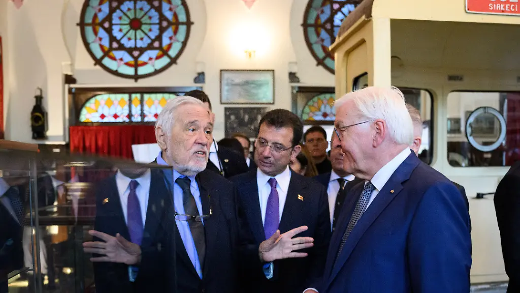 Bundespraesident-Frank-Walter-Steinmeier-vorne-r-wird-zusammen-mit-Ekrem-Imamoglu-M-Oberbuergermeister-von-Istanbul-vom-Historiker-Ilber-Ortayli-l-durch-das-Museum-im-Bahnhof-Istanbul-Sirkeci-gefuehrt-Bundespraesident-Steinmeier-ist-zu-einem-dreitaegigen-offiziellen-Besuch-in-der-Tuerkei-Anlass-der-Reise-ist-das-100-Jubilaeum-der-Aufnahme-diplomatischer-Beziehungen-zwischen-Deutschland-und-der-Tuerkei-Der-Bundespraesident-wird-von-Vertretern-der-Bundesregierung-unter-anderem-Bundesfinanzminister-Lindner-begleitet