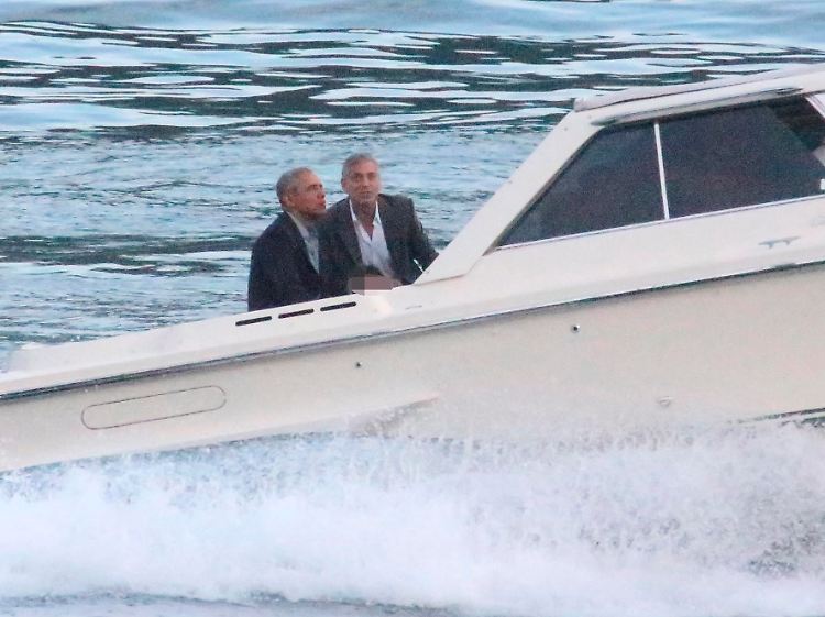 Gemeinsam mit ihren Familien machen Barack Obama und George Clooney eine Spritztour mit dem Motorboot.