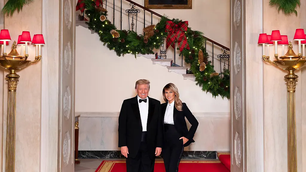 US-Präsident Donald Trump und First Lady Melania Trump haben für ihr letztes offizielles Weihnachtsfoto im Weißen Haus im Partnerlook posiert. Die beiden ließen sich vor einer prunkvoll weihnachtlich geschmückten Treppe ablichten. Beide trugen dabei schwarze Anzüge kombiniert mit weißen Hemden. Laut der Webseite republicworld.com ist der Regierungssitz des Präsidenten dieses Jahr mit 106 Kränzen, 62 Bäumen, mehr als 1.200 Girlanden, 3.200 Lichtern, 17.000 Schleifen und mehr als 150 Arten von Laub und Blumen geschmückt.