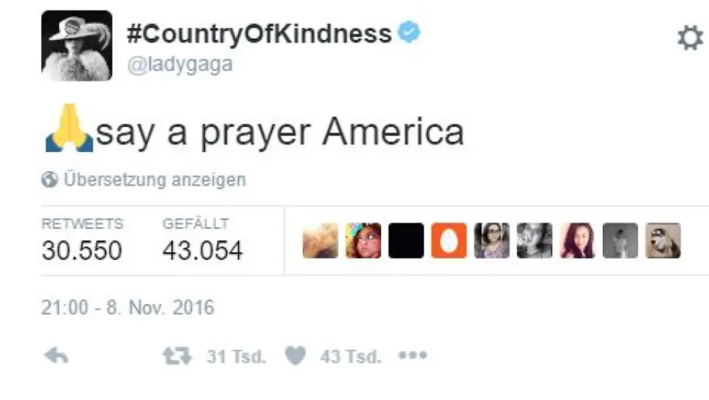 Sängerin Lady Gaga machte sich bis zuletzt im Wahlkampf für Hillary Clinton stark. Für sie können die USA nach Trumps Sieg offenbar nur noch auf Beistand von oben hoffen. "Bete, Amerika", lautet ihre schlichte Botschaft.