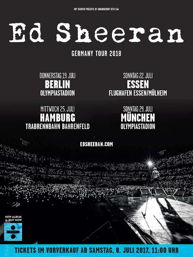 Karten für die deutschen Konzerte von Ed Sheeran sind ab 65 Euro (zzgl. Gebühren) ab Samstag, den 8. Juli 2017, um 11 Uhr online erhältlich. Besonderheit: Die Tickets werden personalisiert verkauft, das heißt der Name des Käufers wird auf die Karte gedruckt und beim Einlass mit einem Ausweisdokument verglichen. Pro Bestellung können maximal vier Tickets erworben werden. So will man dem ausufernden Schwarzmarkt begegnen.