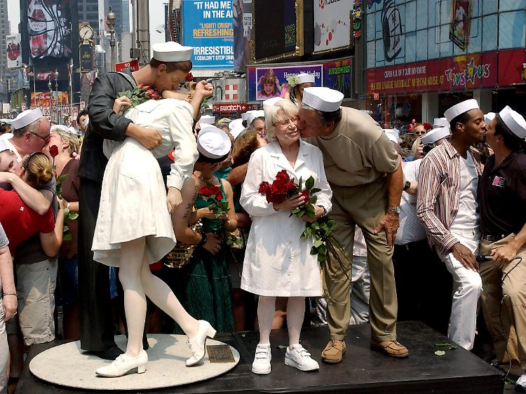 Das Bild des in Polen geborenen New Yorker Fotografen Alfred Eisenstaedt soll am 14. August 1945 entstanden sein, als die Amerikaner auf den Straßen die Kapitulation Japans und das Ende des Zweiten Weltkrieges feierten. Es zeigt einen Matrosen in dunkler Uniform, der eine Krankenschwester spontan in den Arm nimmt und die nach hinten gebeugte Frau auf den Mund küsst. Um sie herum auf dem berühmtesten Stück des Broadways stehen lachende Seemänner und staunende Passanten. Die Szene wird an der gleichen Stelle jeden Tag von Dutzenden Touristen nachgestellt.