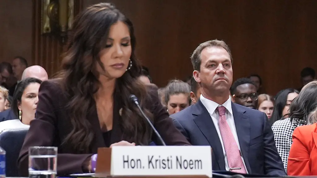 Homeland-Security-Secretary-Kristi-Noem-left-and-her-husband-Bryon-Noem-right-appears-for-an-oversight-hearing-before-the-Senate-Judiciary-Committee-at-the-Capitol-in-Washington-Tuesday-March-3-2026-Her-husband-Bryon-Noem-is-seated-at-center-AP-Photo-J