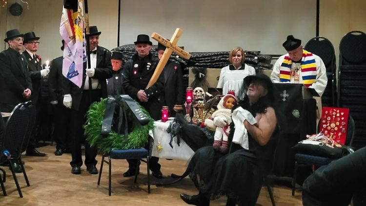 Ortswechsel. Aschermittwoch, 18 Uhr, Dunkelheit legt sich über die Kleingartenkolonie Britzer Wiesen, südliches Neukölln. Versteckt zwischen Datschen und Deutschlandfahnen befindet sich ein Gasthaus. Eine Trauergesellschaft rückt an, Männer im schwarzen Anzug, die Frauen tragen Schleier. Sie wollen zur Beerdigung des Karnevals. Dafür haben sich die "Fidelen Rixdorfer" mit zwei weiteren Berliner Vereinen verbündet, so kommen immerhin ein paar Leute zusammen, es sind circa 50. Herr Steinfels sitzt schon am Platz, Frau Schwan huscht mit einer Liste durch den Raum und versucht aufzuschlüsseln, wer Matjes und wer Forelle bestellt hat.