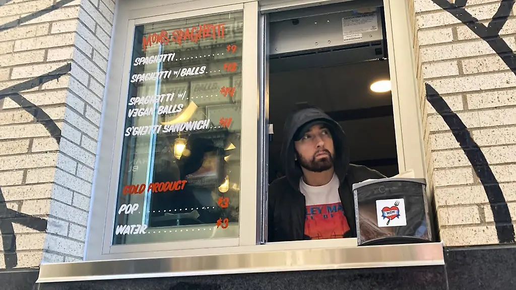 Da staunten die ersten Kunden nicht schlecht, als sie von keinem geringeren als US-Rapper Eminem durchs Fenster seines neu eröffneten Take-away-Restaurants "Mom's Spaghetti" in Detroit persönlich bedient wurden. Das Fenster öffnete sich am Mittwoch um 17 Uhr Ortszeit. Es befindet sich im ebenfalls neu eröffneten Restaurant Union Assembly in der 2131 Woodward Avenue neben dem Fox Theatre.