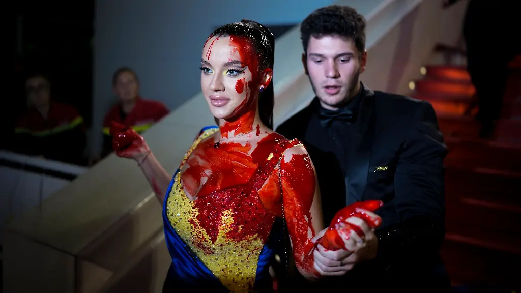 Der Grund: Die Frau vollführte auf dem roten Teppich eine ebenso spektakuläre wie undurchsichtige Aktion. Inmitten des Getümmels um sie herum holte sie auf einer Treppe einen Beutel mit Kunstblut hervor, hielt ihn sich über den Kopf und riss ihn schließlich auf, sodass sich die Farbe über ihren Körper ergoss.