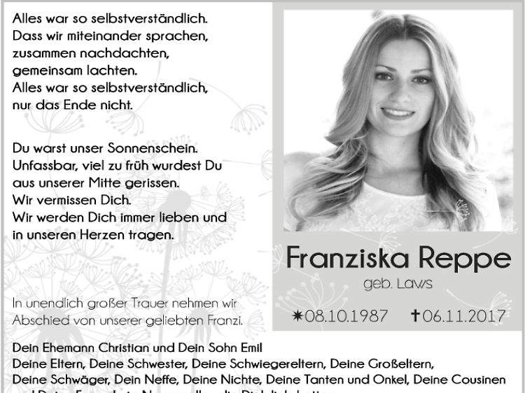 In einer Traueranzeige der Familie heißt es, die junge Frau sei bereits am 6. November gestorben - erst wenige Wochen zuvor hatte die junge Mutter ihren 30. Geburtstag gefeiert. "Alles war so selbstverständlich", heißt es in der Anzeige. "Dass wir miteinander sprachen, zusammen nachdachten, gemeinsam lachten. Alles war so selbstverständlich, nur das Ende nicht." Die Beerdigung sei für den 24. November in Halle geplant.