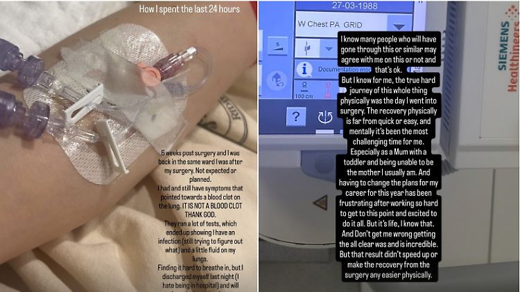 Zu einem Foto, auf dem sie mit einer Infusion im Arm im Klinikbett liegt, schreibt sie: "Ich hatte und habe immer noch Symptome, die auf ein Blutgerinnsel in der Lunge hindeuteten. Gott sei Dank ist es aber kein Blutgerinnsel."