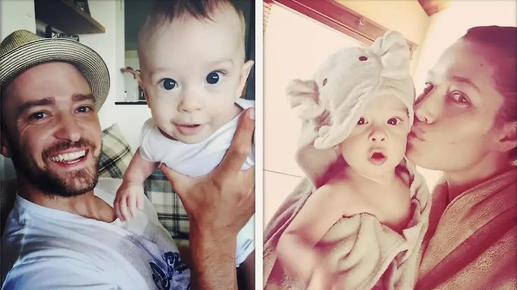 Ein Foto zeigt Silas eingewickelt in ein Handtuch mit Elefantenmütze im Arm von Mama Jessica Biel. Die 33-Jährige drückt ihrem Kind einen Kuss auf die Wange. Auf einem anderen Bild hält Timberlake seinen Sohn stolz grinsend in die Kamera - und auch bei dem Kleinen ist ein Lächeln zu erahnen.