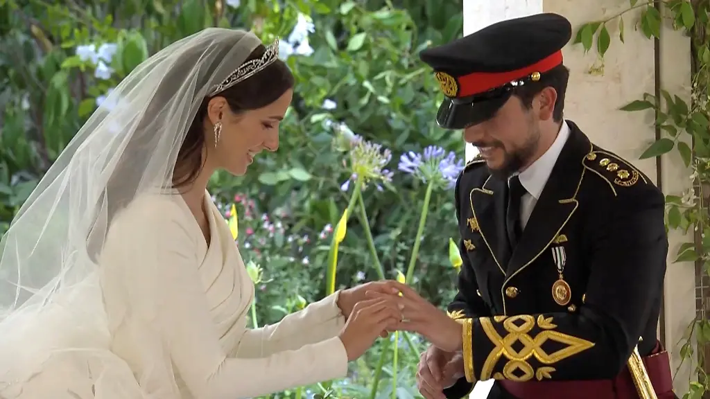 Den Fotos nach zu urteilen, war es ein rauschendes Fest. Jordaniens Kronprinz Hussein bin Abdullah II. trug eine Paradeuniform. Radschwa Al Saif erschien in einem klassischen weißen Brautkleid mit Schleier und langer Schleppe. Ihre Gesichter strahlen, als sie ihre Ringe austauschen und damit besiegeln, fortan als Mann und Frau durchs Leben zu gehen.