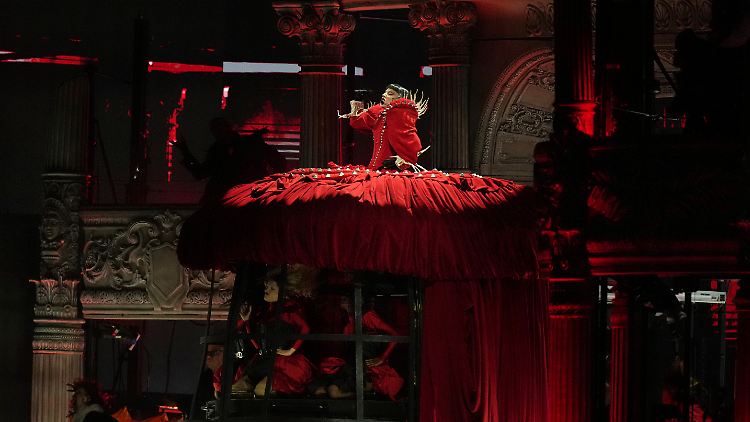 Im ausladenden scharlachroten Kostüm schwebt Lady Gaga über die Bühne.