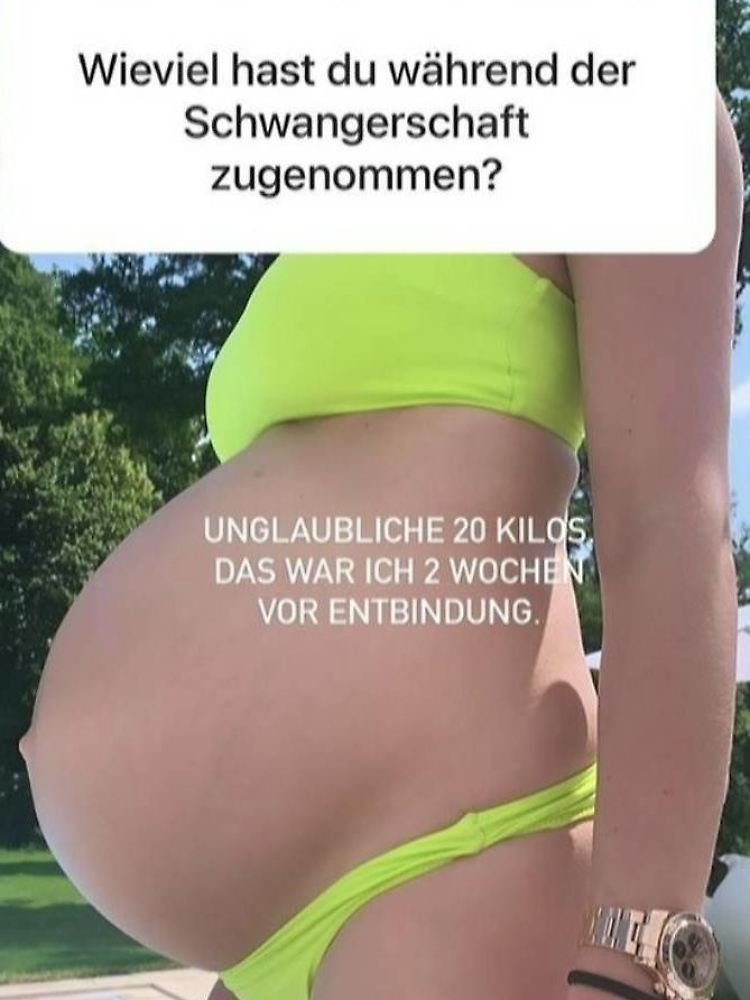 "Unglaubliche 20 Kilos" hat sie mit Zoe im Bauch zugenommen, sagte Gercke in ihrer Instagram-Story, zu der sie prompt auch ein Foto postete, das sie zwei Wochen vor der Entbindung mit riesigem Babybauch im Bikini zeigte.
