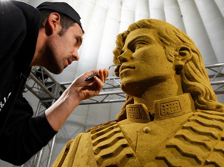 Der russische Künstler Borecki fertigt eine Jackson-Figur während des Sand Sculptures Festival im belgischen Blankenberge.