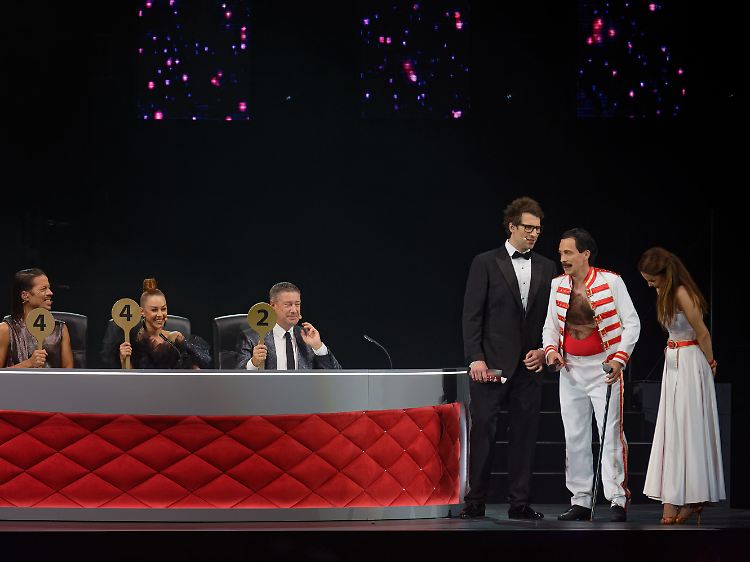 "Eine Woche habe ich in Riesa durchtrainiert", verriet Oliver Pocher kurz vor der Show. Körperlich sei das Tanzen "extrem anstrengend", sagte der Comedy-Star, der den 9000 Zuschauern von Moderator Hartwich als "Maskottchen" angekündigt wurde. In einer aufwändig vorbereiteten Choreografie tanzte Pocher an der Seite seiner Profi-Partnerin Christina Luft als Queen-Sänger Freddie Mercury verkleidet über die Bühne.