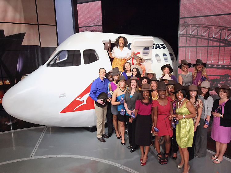 Oprah Winfrey (in der Flugzeugtür) im Studio nach der Ankündigung, mit Studiopublikum nach Australien zu reisen.