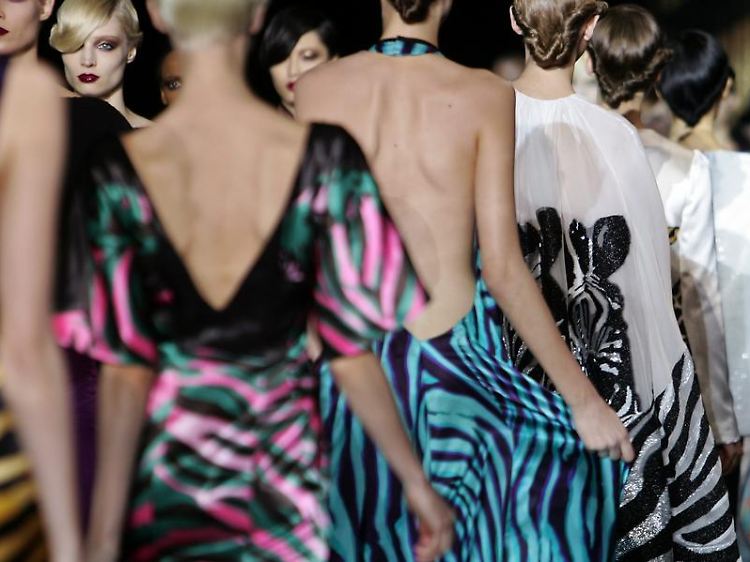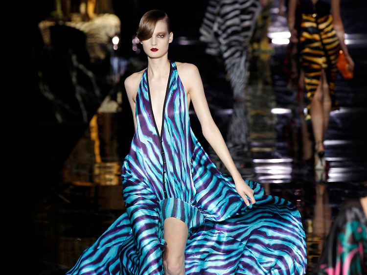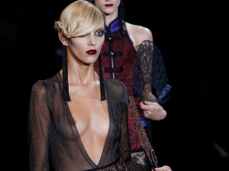 Schmale Charlestonkleider mit mehrlagig wippenden Stufen aus Goldfäden, hochgeschlitzte chinesische Seidenkleider in leuchtendem Lila, ein Hauch von schwarzer Spitzenbluse oder dünne Lurexkleider, unter denen jede Muskelbewegung zu erkennen war, vibrierten vor Erotik. Am Ende der Schau erschien das frühere Topmodel Kristen McMenamy mit einer schwarzen weiten Hose und einem in Zebramuster bemaltem Oberkörper. Alles wirkte leicht dekadent und äußerst begehrenswert, ein Paradies der Künstlichkeit.