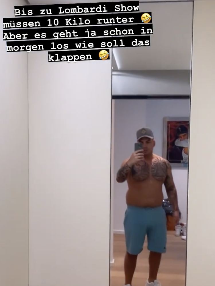 In seiner Instagram-Story erklärt Lombardi, das Problem jetzt wirklich angehen zu wollen beziehungsweise angehen zu müssen. Denn der Countdown bis zum Start seiner eigenen "Lombardi Show" bei RTL+ läuft bereits, und bis dahin sollen zehn Kilo verschwunden sein. "Ich bin dick", so Lombardi offen, ehrlich und selbstkritisch. In dem Spiegel eines Aufzugs präsentiert er dazu seine Hüften, die "komplette Mülltonne" sind, wie er es nennt.