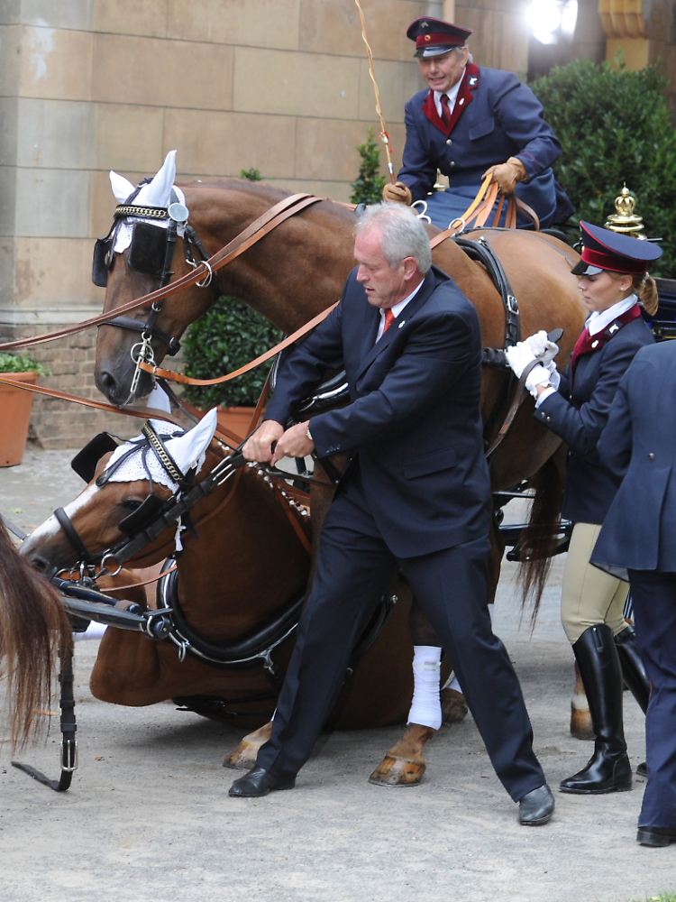 Dramatische Sekunden gab es vor der Friedenskirchezu überstehen: Vor dem Portal wartete der blaue Landauer, um das Paar durch die Innenstadt zu kutschieren. Doch dann bricht eines der sechs Pferde zusammen. Kutscher Klaus Eckert behielt die Nerven, Gestütschef Jürgen Müller sprang ihm zur Seite - und Agulan stand wieder auf den Beinen. "Als es darauf ankam, haben wir unseren Mann gestanden", meinte Müller hinterher erleichtert. "Das Brautpaar hat von den Schreckenssekunden nichts mitbekommen."
