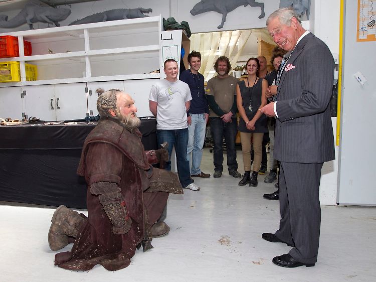 Prinz Charles hatte am Morgen unter anderem Weta besucht, die Firma für filmische Spezialeffekte von Regisseur Peter Jackson. Dort kniete auch der Zwerg Dori, der im nächsten Hobbit-Film auf Abenteuerreise geht, formvollendet vor dem Prinzen. Am 28. November hat "Der Hobbit - eine unerwartete Reise" in Wellington Weltpremiere.