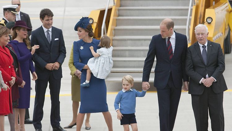 Es ist der kleine Prinz, auf den sich die Kameras richten. Kurze Hosen, blauer Pullover, Kniestrümpfe - ein blonder Dreijähriger, der nach einem Interkontinental-Flug ziemlich wackelig die Gangway hinuntergeht. George, "der künftige König", wie ihn britische Medien gerne nennen, ist zur einwöchigen Reise in Kanada eingetroffen. Er geht an der Hand von Vater William, Mutter Kate hat seine Schwester Charlotte auf dem Arm - doch es ist wieder einmal der blonde Prinz, der im Mittelpunkt steht.