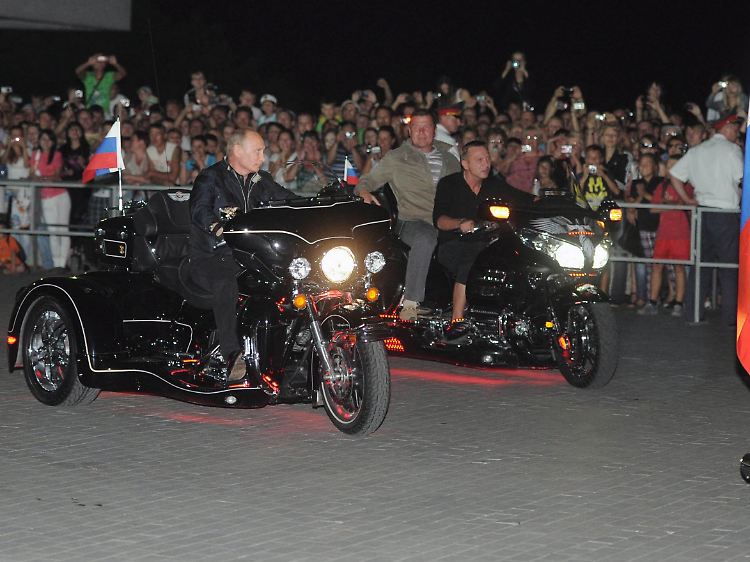 Bei einem Biker-Treffen am Schwarzen Meer hat der russische Regierungschef sich als kerniger Motorradfahrer inszeniert und Motorradrocker als seine "Brüder" bezeichnet. Der ganz in schwarz gekleidete Putin führte am Montagabend mit einem dreirädrigen Motorrad gemeinsam mit dem Chef des Bikerklubs Nochniye Volki ("Nachtwölfe") eine Kolonne an, die zu einem Treffen auf einem früheren sowjetischen Kriegsschiff im Hafen von Noworossijsk fuhr. Unter Jubel dankte er seinen "Brüdern" dafür, dass sie mit der Wahl ihres Treffpunkts gezeigt hätten, dass sie "das Heldentum der Vergangenheit nicht vergessen" hätten.
