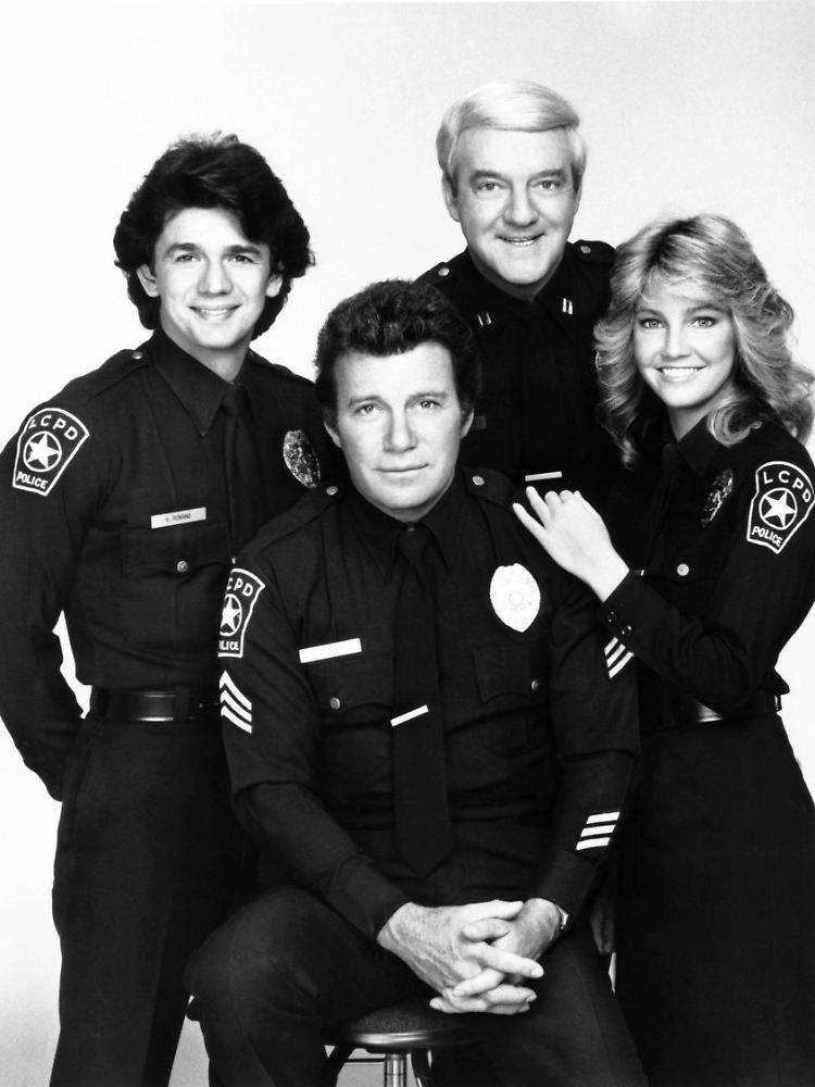 In "T.J. Hooker" spielte Herd an der Seite von Adrian Zmed (l.), William Shatner (2.v.l.) und Heather Locklear.