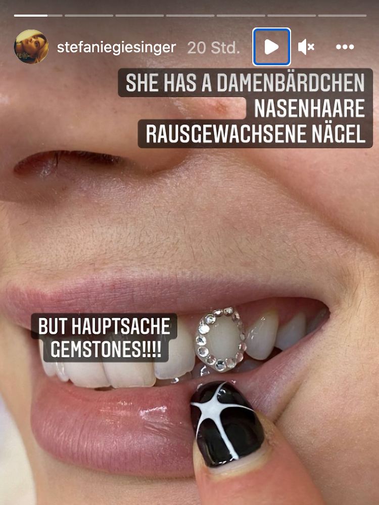 Model und Influencerin Stefanie Giesinger steht zu den Härchen in ihrem Gesicht. Das macht sie mit ihren jüngsten Instagram-Storys deutlich. "She has a Damenbärtchen, Nasenhaare, rausgewachsene Nägel", schreibt sie zu einer entsprechenden Nahaufnahme ihres Gesichts und eines Fingers. "But Hauptsache Gemstones", fügt die einstige "Germany's next Topmodel"-Gewinnerin in ihrem Deutsch-Englisch-Mix weiter hinzu. Mit den Gemstones meint sie die kleinen funkelnden Steinchen, die auf ihrem Eckzahn kleben.