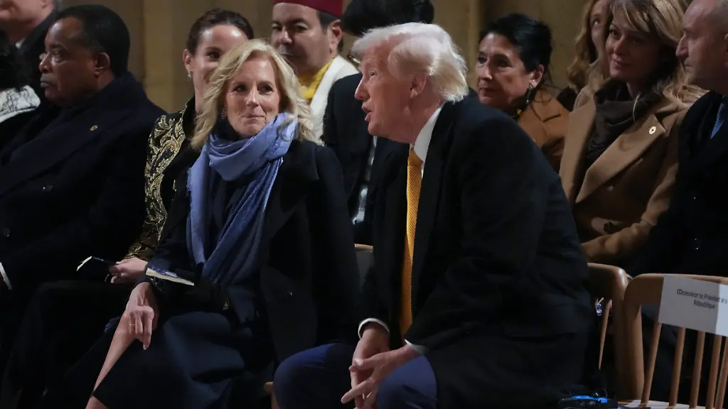 Bei der Wiedereröffnung von Notre Dame in Paris plaudern Jill Biden und Donald Trump miteinander. Ein Foto, auf dem die First Lady ihn besonders herzlich ansieht, verwendet der künftige US-Präsident nun für die Werbung seines neuen Parfüms. Dessen Name: "Fight, Fight, Fight".
