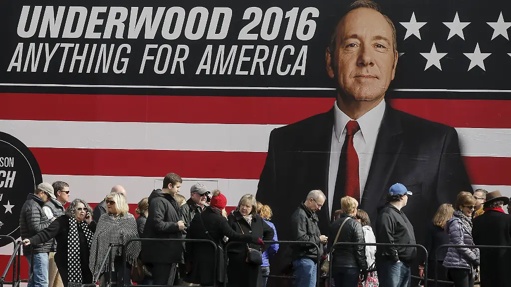 Frank Underwood mischt den US-Wahlkampf auf - zumindest wenn es nach dem Streamingdienst Netflix geht. Im Bundesstaat South Carolina, wo demnächst die nächsten Vorwahlen anstehen, ist der fiktive Machtpolitiker aus der Serie "House of Cards" mit einem eigenen Wahlkampfstand vertreten. Wie amerikanische Medien berichteten, standen Fans in Greenville Schlange, um Sticker und T-Shirts mit dem Logo "FU2016" abzugreifen. Kevin Spacey, der Underwood in der Serie spielt, war allerdings nicht da.