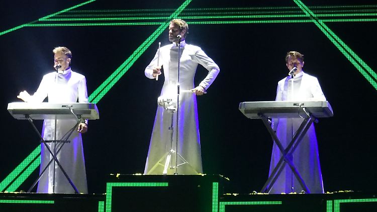 Und was fahren die Briten in den kommenden 120 Minuten nicht alles auf: Feuerfontänen schießen zu "Get Ready For It" aus dem Boden. "Affirmation", bei dem Barlow, Donald und Owen auf drei hohen Podesten vor Keyboards und einem Drumpad stehen, ist eine Hommage an Kraftwerk, und zu der Ballade "Flaws" performen Donald und Owen eine moderne Tanzchoreographie, die von den Männer belächelt wird, die Frauen jedoch zum Kreischen bringt.