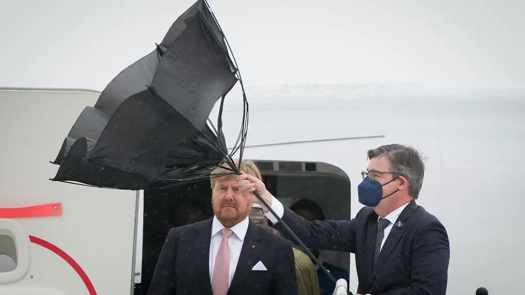 Zu einer kleinen Panne kam es, als König und Königin im strömenden Regen aus dem Jet stiegen. Der Schirm eines bereitstehenden Mitarbeiters klappte im Wind um und musste gebändigt werden. König Willem-Alexander trug Anzug, Krawatte und Bart. Máxima kam im hellen Sommerkleid mit Handschuhen, umgehängter Jacke und Hut. Auf dem Rollfeld trugen dann beide wegen der Corona-Pandemie Gesichtsmasken.