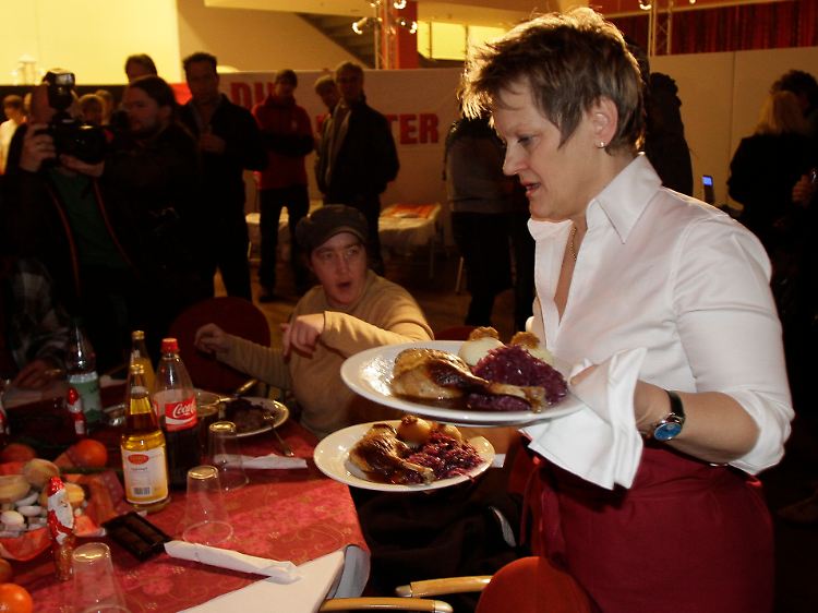 Den Berliner Bedürftigen wurden Gänsekeulen, Kartoffelklöße und Rotkohl serviert. "Seit zwei Tagen sind etwa 30 Köche im Einsatz", erläuterte Hotel-Pressesprecherin Miranda Meier. Die vielen freiwilligen Helfer beim Service erhielten von prominenter Seite Unterstützung. So packte etwa Ex-Boxer Axel Schulz mit an, auch die Sängerin Nina Hagen und die Grünen-Politikerin Renate Künast hatten sich als Kellner angekündigt.