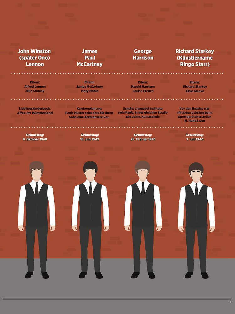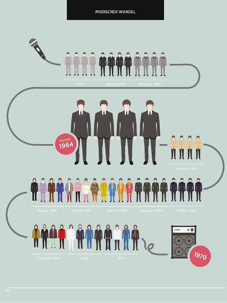 Was hier extrem kurz zusammengefasst wurde, geht auch viel länger, genauer und detaillierter - und genau das haben zwei britische Nerds mit dem Buch "Die Beatles-Story" gemacht. Die Grafikdesigner John Pring und Rob Thomas haben so ziemlich alles zusammengetragen, was man über die Band zusammentragen kann. Sie bringen diese Masse an Information aber nicht etwa in Form eines dicken, textlastigen Buches heraus, sondern mithilfe von Bildern - mit Infografiken, Karten und Zeitlinien in verschiedenen Farben und Formen. Die Grafiken sind zwar oft mit ergänzendem Text versehen, aber in aller Kürze und übersichtlich.