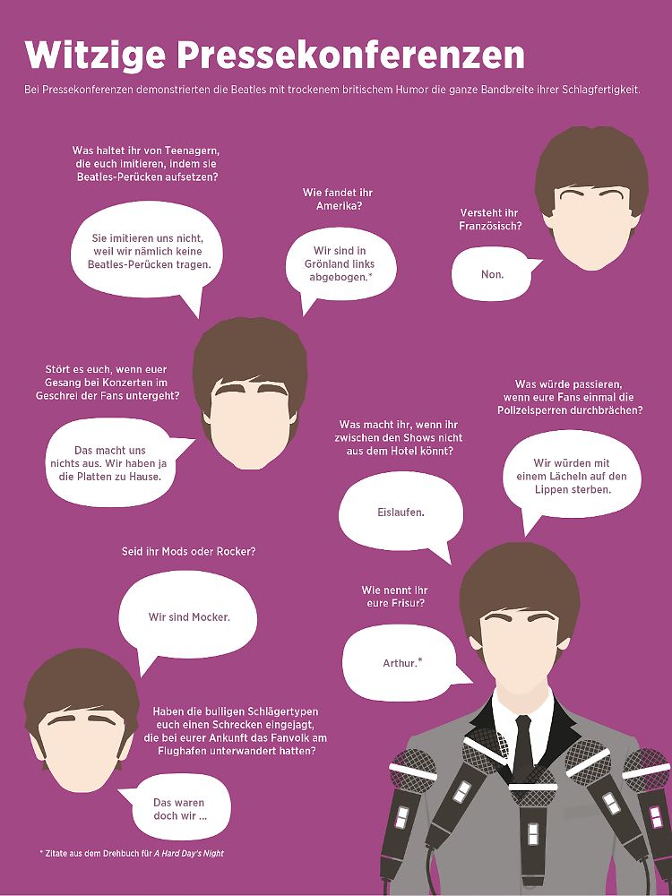 Wer sich schon immer gefragt hat, auf welchen Gitarren die Beatles eigentlich spielten - hier erfährt man es. Ebenso, wovon einzelne Songs wie "Penny Lane", "Paperback Writer" oder "I am the Walrus" eigentlich handeln. Die Verschwörungstheorien um den angeblichen Tod von Paul McCartney im Jahr 1966 werden anhand einer "Blütenlese der Lieblingstheorien" der Autoren vorgestellt. Und natürlich ihre Filme - von "A hard day's night" 1964 bis zu "Let it be" 1970.