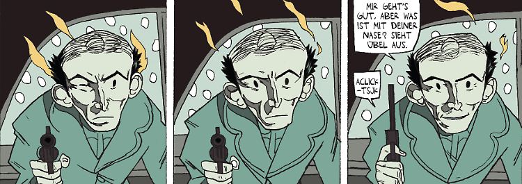Mit klarem Strich, aber ungewöhnlichen, kantigen, fast schon expressionistischen Formen erzählt Mosdal seine Geschichte. Die Farben sind meist gedämpft, was die mythische Atmosphäre geschickt unterstützt. Auch die Story hat trotz einiger Rückblenden eine klare Linie. Wobei man letztlich Realität und Halluzinationen nicht mehr unterscheiden kann.