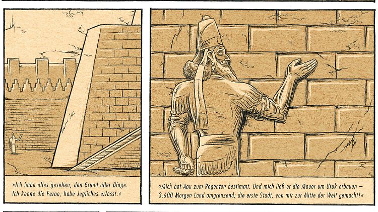 Auch zeichnerisch ist Harder konsequent: Der Comic ist im Grunde ein langes Relief. Die Figuren sind ausschließlich aus seitlicher oder frontaler Perspektive zu sehen. Ihm sei es darum gegangen, zeichnerisch die Jahrtausende alten Reliefs oder Statuen zu zitieren und zum Leben zu erwecken, schreibt Harder - ohne sie aber zu imitieren. So wirken die Zeichnungen, deren Kolorierung dem Ocker gebrannter Steintafeln ähnelt, trotz ihrer Reliefartigkeit und formalen Strenge dynamisch. Sie ergänzen den Text, teilweise erlauben sie sich auch ironische Überspitzungen des Geschriebenen. Harders "Gilgamesch" ist keine publikumswirksame, leicht verdauliche Umsetzung des Stoffs, sie erfordert ein gehöriges Maß an Zuwendung. Aber sie ist eine Möglichkeit, sich mit dem Beginn der Dichtkunst neu auseinanderzusetzen. Und mit dem Vorbild aller Helden und Heldinnen dieser Welt.