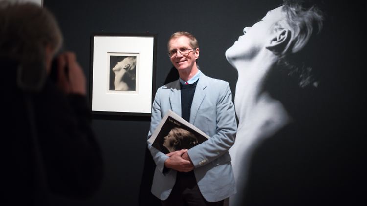 Antony Penrose in einer Ausstellung vor einem Foto von Man Ray: "Lee Miller (Neck)".