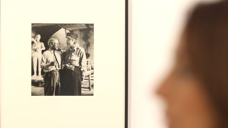 Pablo Picasso und Lee Miller im August 1944 in seinem Studio in Paris, während der Befreiung der Stadt. Nach ihrer Begrüßung sagte Picasso: "Der erste Soldat der Alliierten, den ich zu sehen kriege, bist ausgerechnet du!"