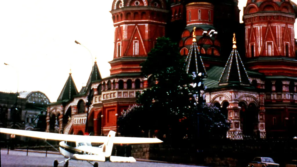 Gegen Abend erreicht er Moskau. Von Westen fliegt er in Richtung Stadtzentrum, sieht die bombastischen Wolkenkratzer, den Ostankino-Fernsehturm und den Triumph-Palast. Rust kommt sich ziemlich klein vor in seiner acht Meter langen Cessna. Doch der 18-Jährige ist schon viel zu weit, um umzukehren. Er entdeckt das Gebäude des Kreml, das Lenin-Mausoleum, die Basilius-Kathedrale: Sein Ziel ist nicht mehr weit.