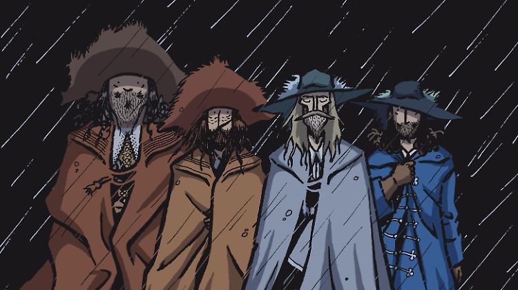 Vier Männer im Regen: Portos, D'Artagnan, Athos, Aramis (v.l.).