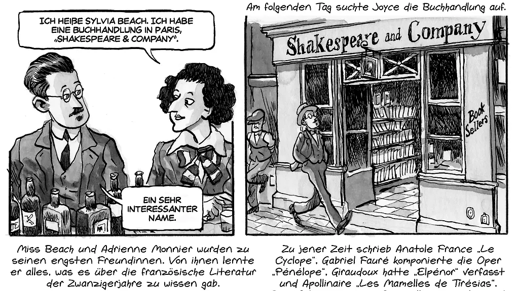 Das ergibt eine ungeheure Fülle an Ereignissen. Und Zapico gibt sich alle Mühe, kein Detail, keine Begegnung aus Joyces Leben auszulassen. Leider zerfasert das Buch angesichts dieses hohen Tempos stellenweise. Da wird Anekdote an Anekdote gereiht, werden neue Figuren vorgestellt, die dann ebenso unvermittelt wieder verschwinden. Zudem setzt der Comicautor auf viele Erklärtexte, um seine Geschichte voranzubringen, statt Bilder und Dialoge für sich sprechen zu lassen. Vielleicht wäre es hier besser gewesen, die Handlung zu straffen und dafür mehr Wert auf die Comic-Dramaturgie zu legen.