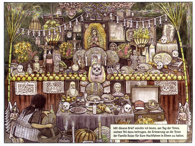 Das Totengedenken der Familie Rojas, das Pestemer beschreibt, ist für den deutschen Betrachter ungewöhnlich. Auf einem Totenaltar werden die Fotos der Verstorbenen aufgestellt. Erinnerungsstücke, Blumen, Kerzen, Früchte und Schädel aus Zuckerguss stehen daneben, an Girlanden hängen Skelette. Auch der Friedhof wir bunt geschmückt. Gemeinsam verbringt man die Nacht an den Gräbern, isst und singt. Die Farben, die Gemeinsamkeit, die Erinnerung stehen dem Tod entgegen. Sie entreißen dem die Verstorbenen dem Vergessen.