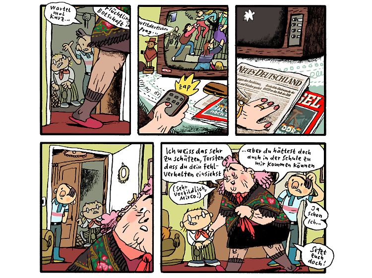 "Mirco ist ziemlich so wie Mawil. Nur hat Mawil in seiner Kindheit nicht so viel erlebt wie Mirco", erzählt er im Gespräch mit n-tv.de. "Aber ich war genau so schüchtern und ängstlich und bin gefährlichen Situationen aus dem Weg gegangen." Als Zeichner hat er aber kaum Mitleid mit seiner Hauptfigur: Mirco wird permanent in Konflikte verwickelt. Da bekommt es der Siebtklässler mit Rowdys aus der FDJ zu tun, muss sich mit der kleinen Schwester, den Eltern und dem mürrischen neuen Mitschüler Torsten herumschlagen, der nicht bei den Jungen Pionieren ist, und erst recht mit der linientreuen, strengen Lehrerin Frau Kranz.