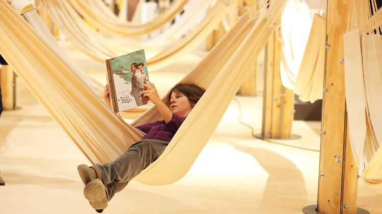 Blick in den brasilianischen Pavillon auf der Buchmesse: Hängematten laden zum Lesen ein - in diesem Fall einen Comic über die letzten Tage von Stefan Zweig im brasilianischen Exil.