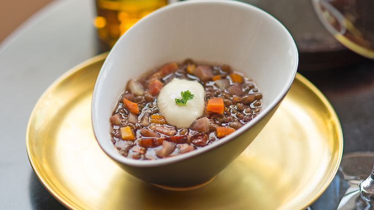 Der wahre Wert der Linsen wird oft verkannt, dabei sind sie nicht nur besonders nahrhaft (275 kcal/100 g) und sättigend, sondern verfügen auch über eine Flut von Mineral- und Nährstoffen: Eisen, Kalium, Kalzium, Zink und Provitamin A. Durch den hohen Eiweißanteil (21 Prozent) bieten sie sich vor allem für die vegane Kost an. Ballaststoffe machen 11 Prozent aus. Fett ist mit 0,8 Prozent so gut wie nicht existent in Linsen und dazu kommt, dass dank des enthaltenen Magnesiums und des B-Vitamins Cholin beim Verzehr von Linsen die körpereigene Fettverbrennung beschleunigt wird. Der Anteil der Kohlenhydrate ist mit 50 Prozent überdurchschnittlich hoch und unterstreicht die Rolle der Linsen als Kalorienspender. Wie eine einfache Linsensuppe gehobenen Ansprüchen gerecht wird, zeigt uns Spitzenköchin Léa Linster. "Mein Linseneintopf braucht ein Glas Rotwein", schreibt sie in dem Buch "Wein muss rein!". "Er bringt den nussigen Geschmack der Linsen erst richtig zur Geltung." Ich darf Ihnen das Rezept, inklusive Weinempfehlung, aus Léas neustem Buch verraten: